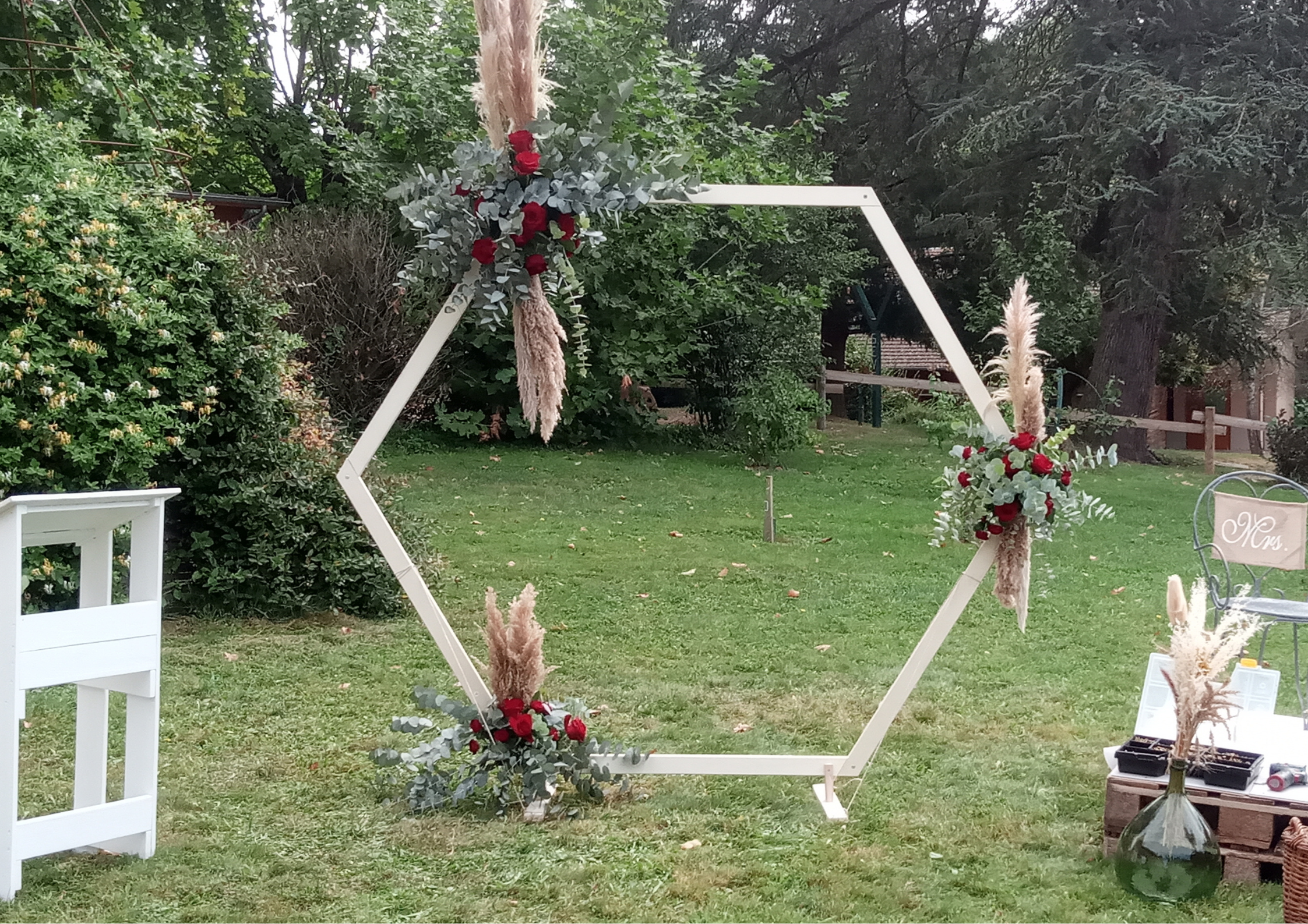 - Décoration de cérémonie : arches fleuries, bancs d’église, pétales de roses pour l’allée… Nous apportons une touche florale magique à votre union.