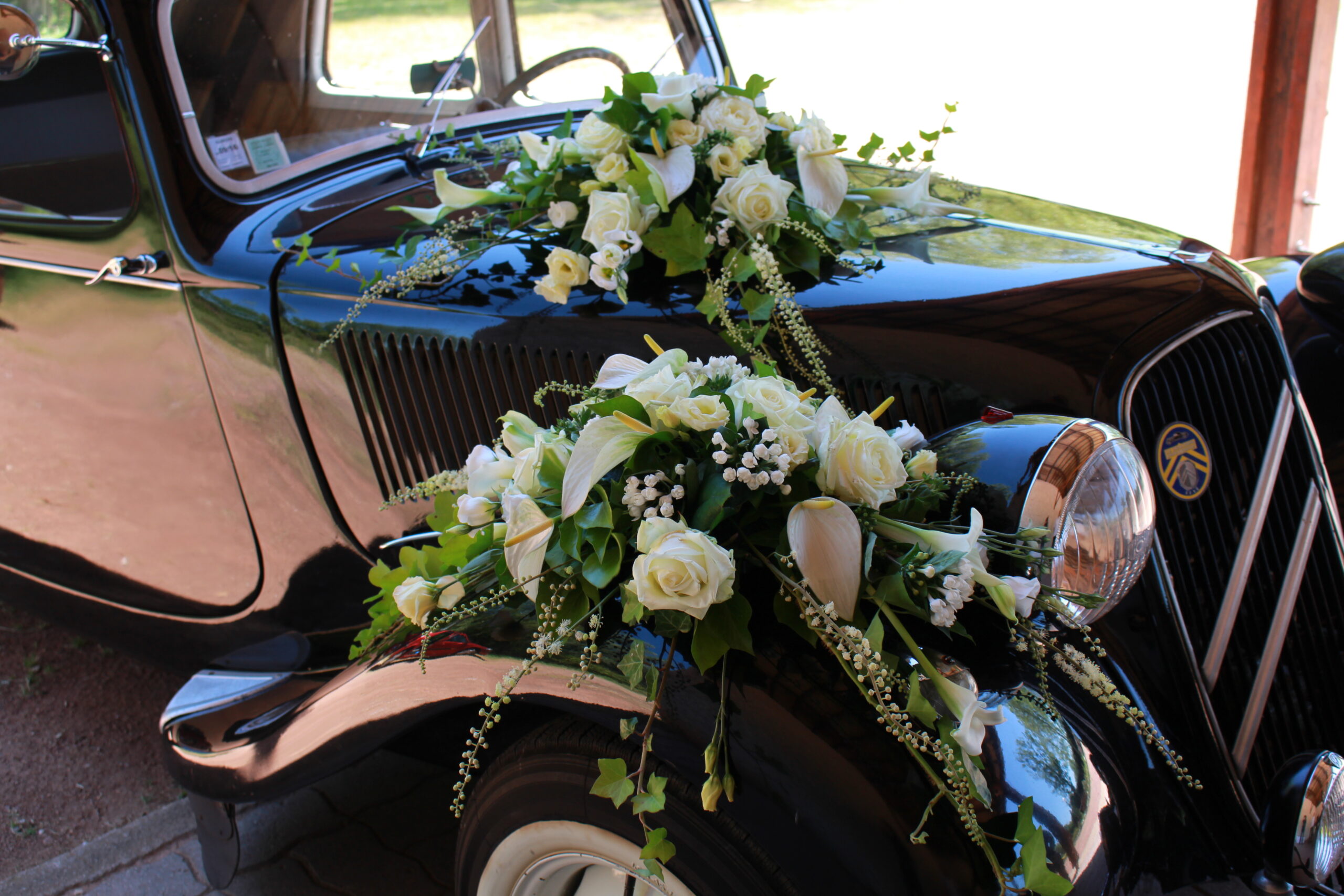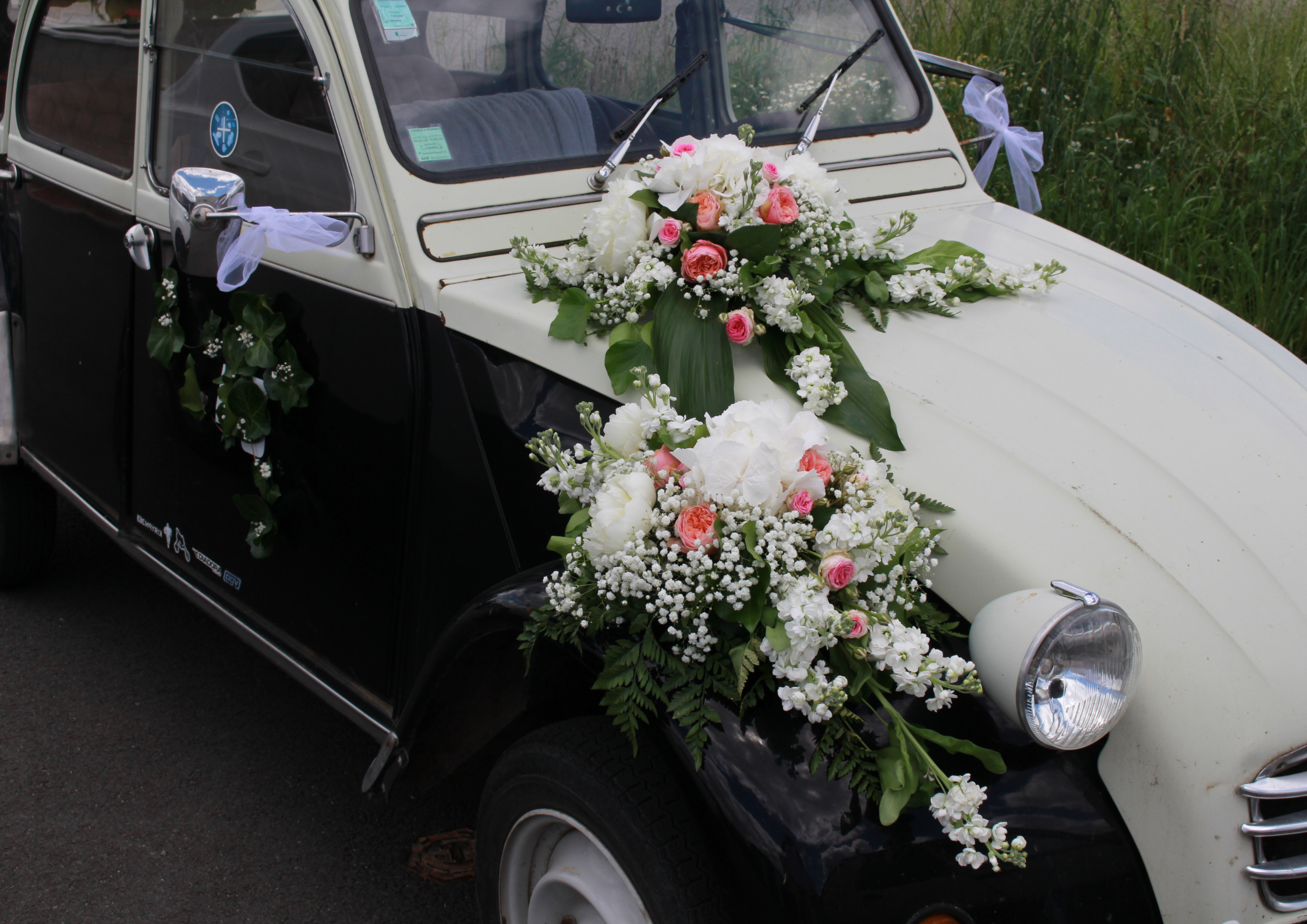 - Voitures et extérieurs : ornements floraux pour voiture de mariage, compositions pour l’entrée du lieu de réception…
